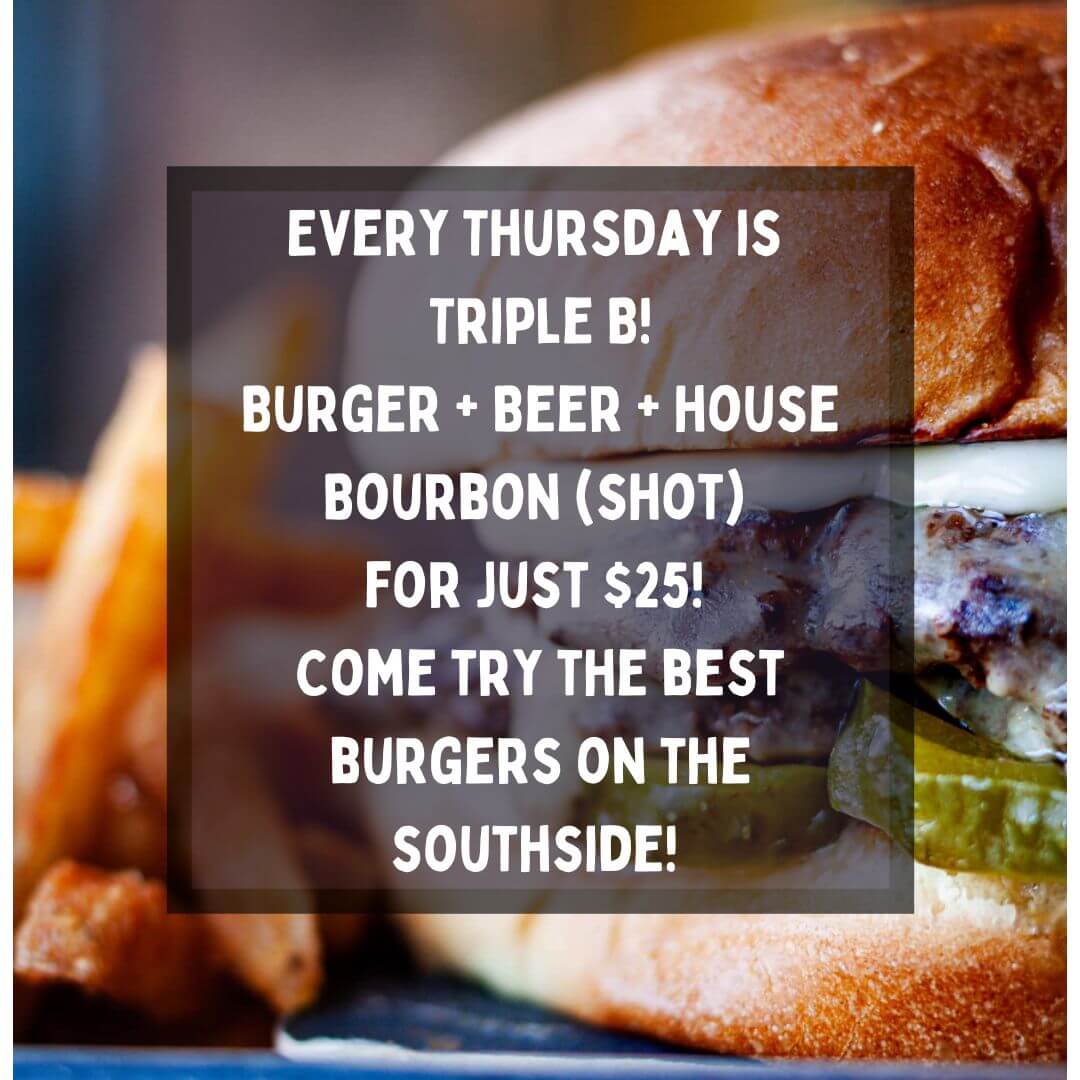 Any burger on the menu + pint of beer + bourbon shot for only $25